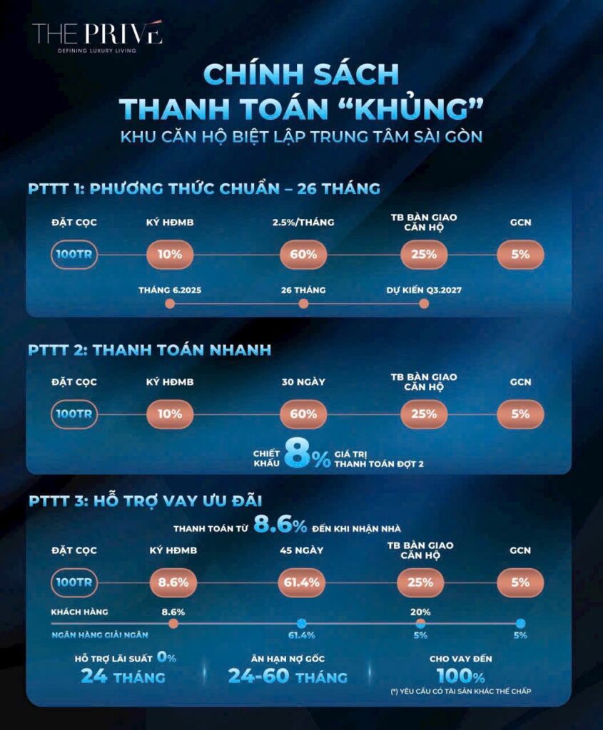 Đây cũng là lý do The Privé trở thành tâm điểm bất động sản khi đáp ứng đúng nhu cầu của khách hàng muốn sở hữu “nhà sang” ngay trung tâm Sài Gòn với mức giá tốt nhất – chỉ từ 99 triệu/m² (khoảng 5,9 tỷ/căn), bàn giao hoàn thiện nội thất cao cấp.