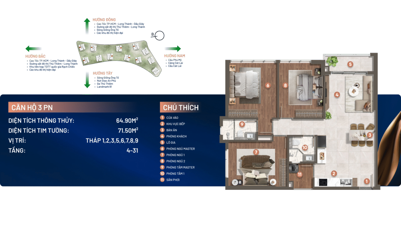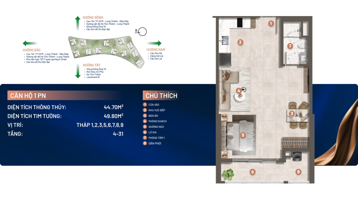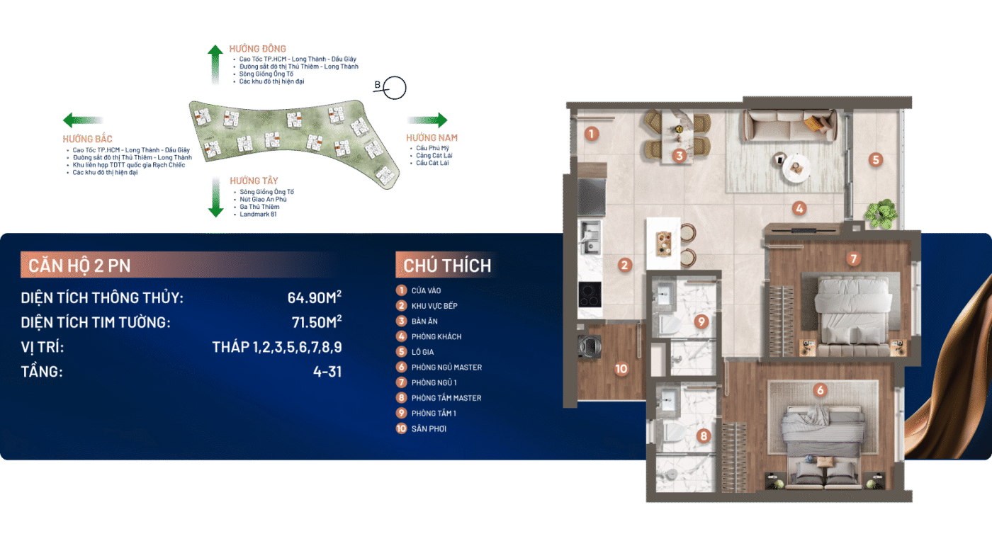 Dự án sở hữu vị trí đắc địa với 3 mặt giáp sông Giồng Ông Tố và mặt tiền đường song hành cao tốc TP.HCM – Long Thành – Dầu Giây, cách nút giao An Phú chỉ khoảng 1km, thuận tiện kết nối đến các khu vực trọng điểm như Thủ Thiêm, Quận 1 và sân bay Long Thành trong tương lai