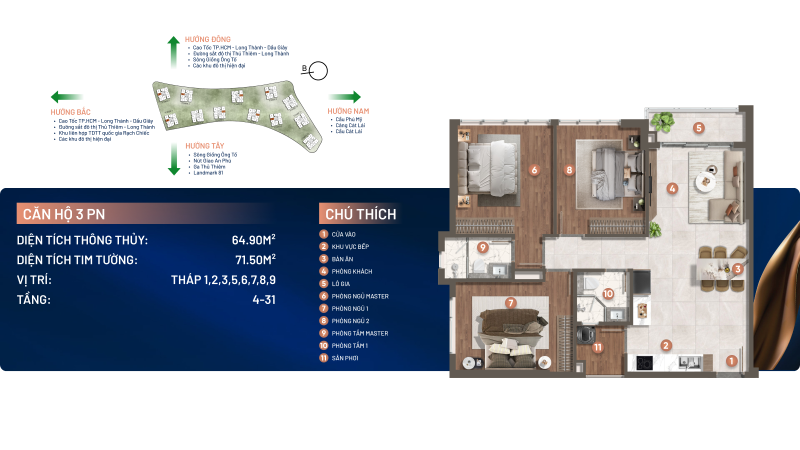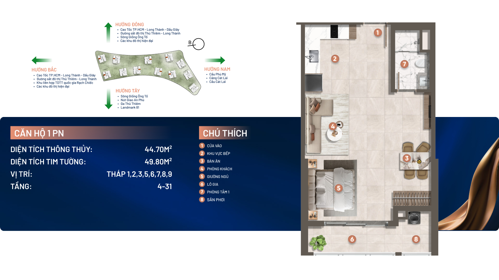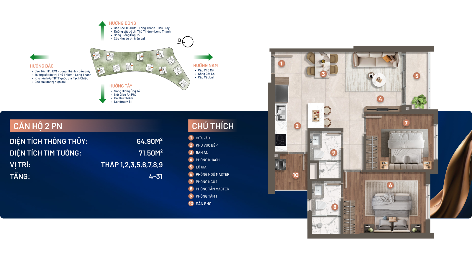 Dự án sở hữu vị trí đắc địa với 3 mặt giáp sông Giồng Ông Tố và mặt tiền đường song hành cao tốc TP.HCM – Long Thành – Dầu Giây, cách nút giao An Phú chỉ khoảng 1km, thuận tiện kết nối đến các khu vực trọng điểm như Thủ Thiêm, Quận 1 và sân bay Long Thành trong tương lai